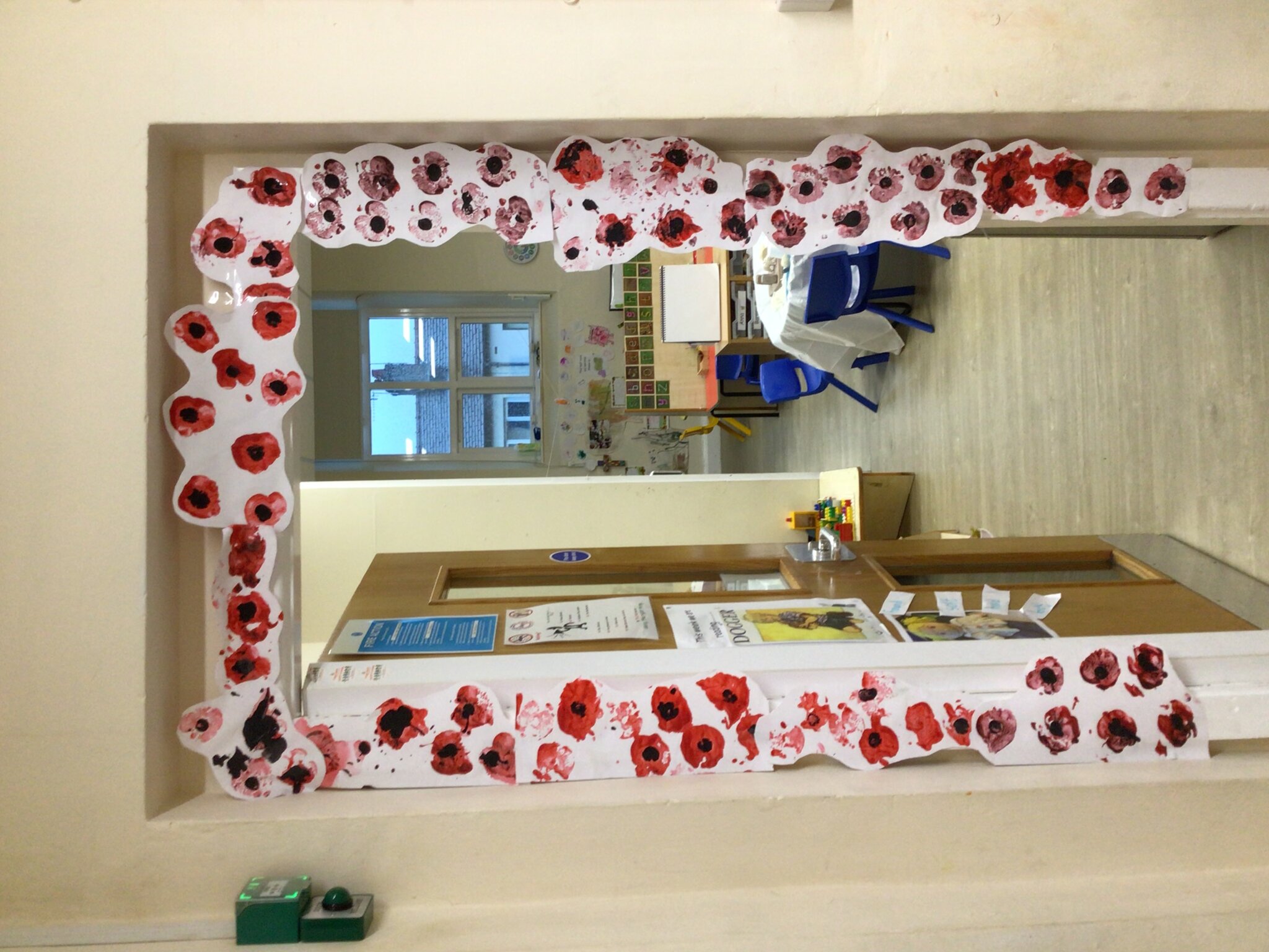 Today we remembered all people and animals killed or injured by war. We wanted to put our poppies outside but due to the bad weather we made an arch to walk under instead.