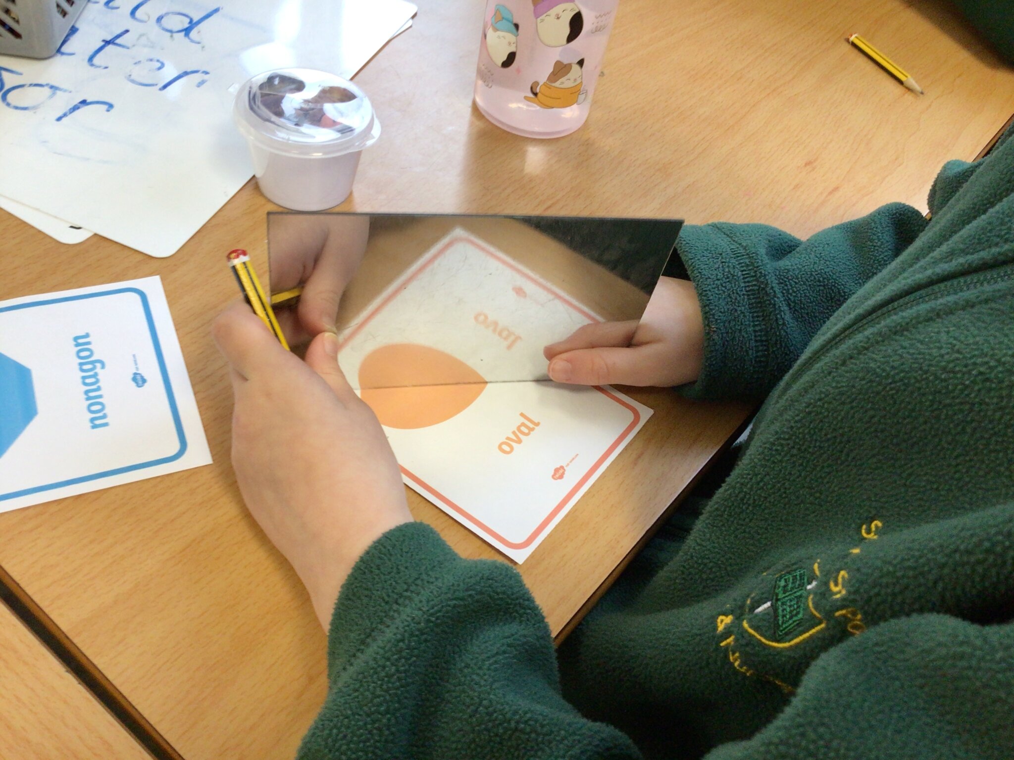 This morning, we were using mirrors to look for lines of symmetry in 2D shapes.