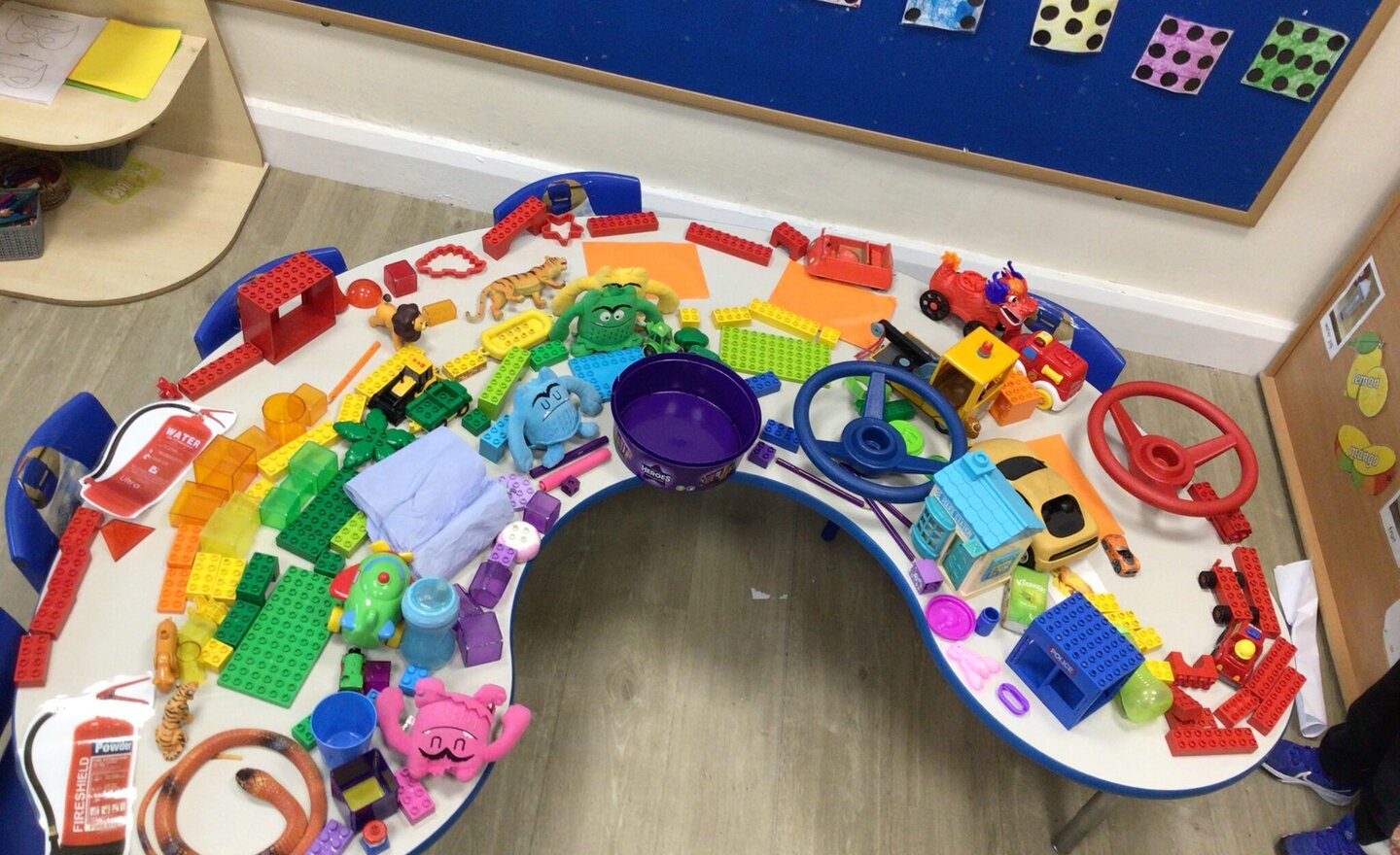 We listened to the story of Noah. The children were very interested in the part about the rainbow. We used a handy table to make our loose parts rainbow. The children all talked about their favourite colours.